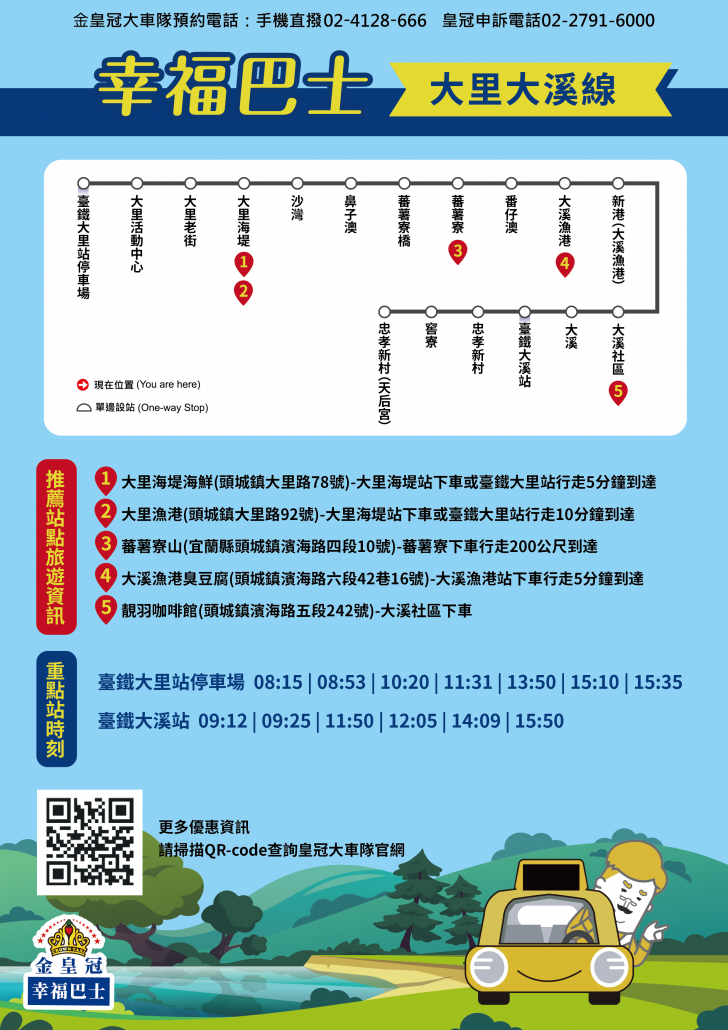 打造友善頭城幸福巴士交通服務,接駁鄉民至市區滿足民生需求,就醫、就學、採買增加便利性,皇冠大車隊提供五心級的服務,全程軌跡紀錄,讓您整趟路途更加安心放心!!!